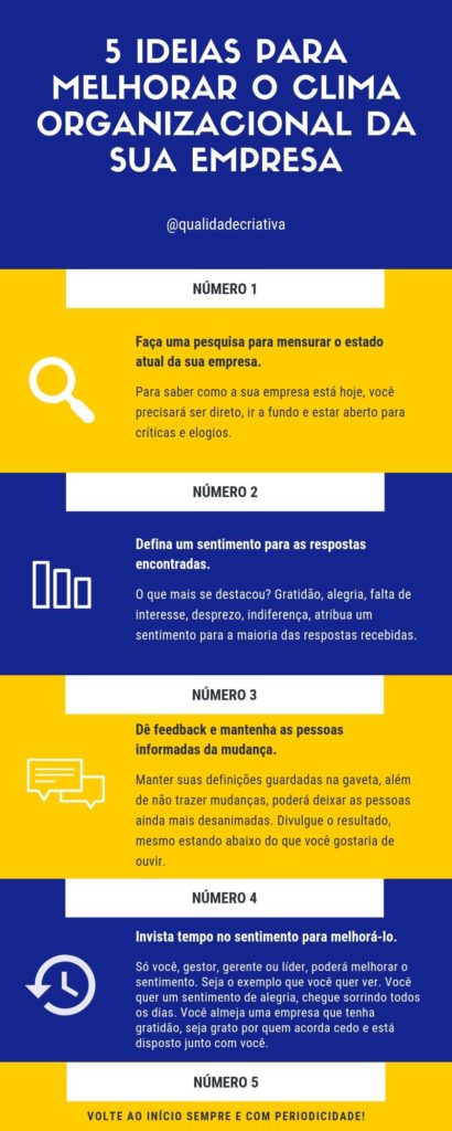 Sem mais esperar, nosso infográfico mostra 5 dicas práticas de como melhorar o “clima” organizacional, a partir dos sentimentos da organização.